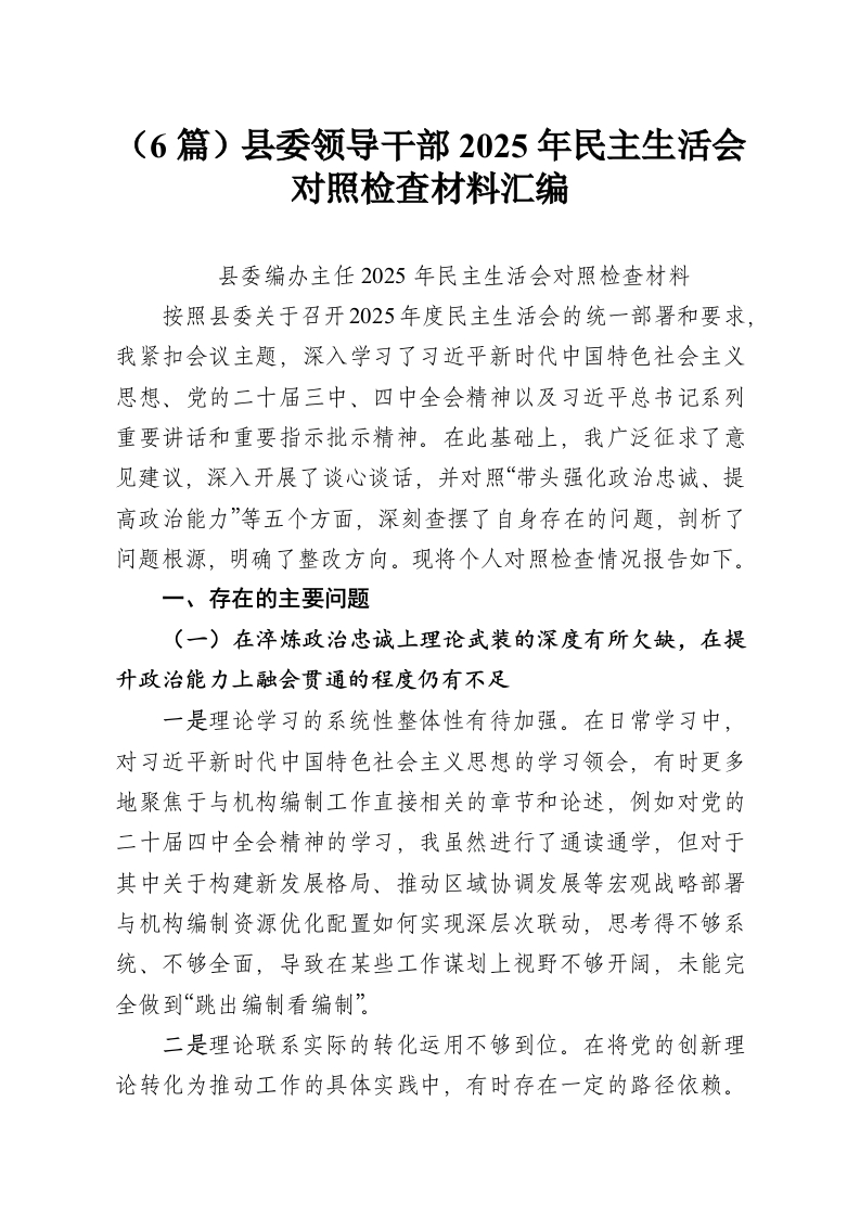 (6篇)县委领导干部2025年民主生活会对照检查材料汇编