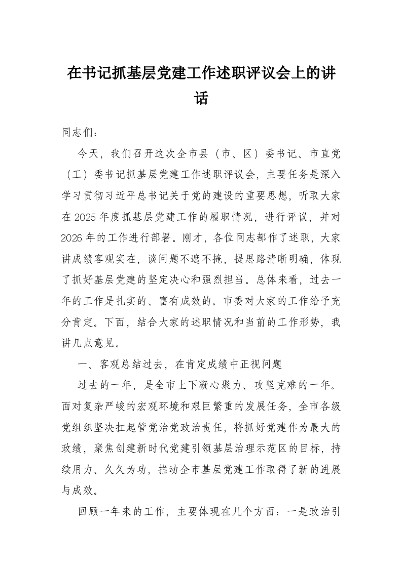 在书记抓基层党建工作述职评议会上的讲话