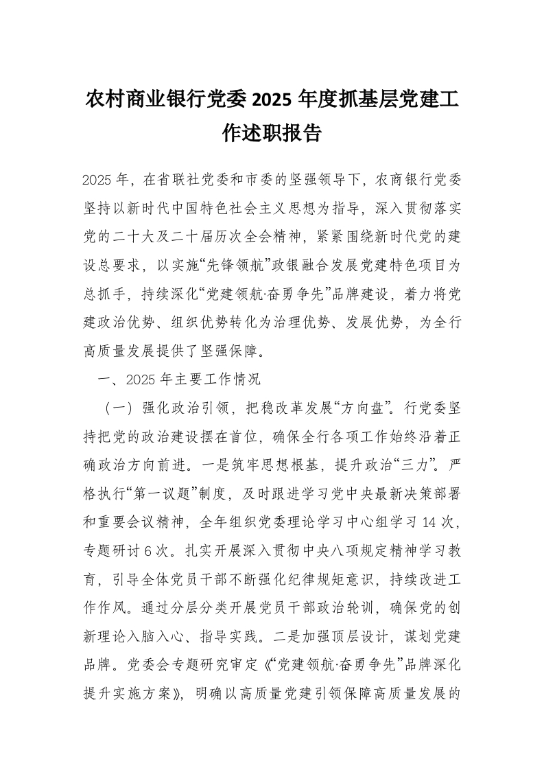 农村商业银行党委2025年度抓基层党建工作述职报告