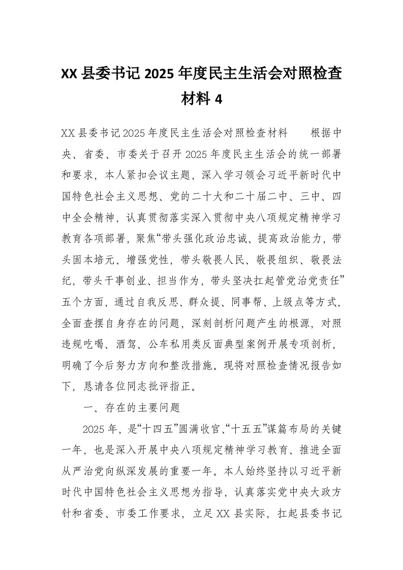 首页工作文档XX县委书记2025年度民主生活会对照检查材料4