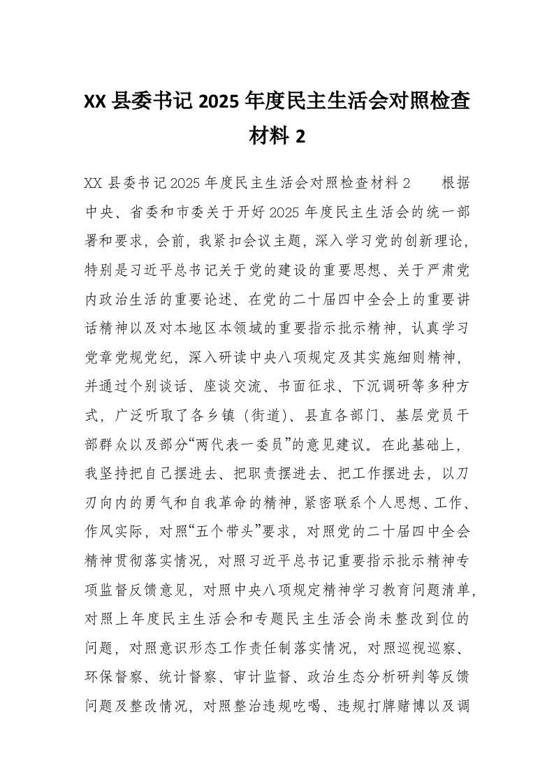 首页工作文档XX县委书记2025年度民主生活会对照检查材料2