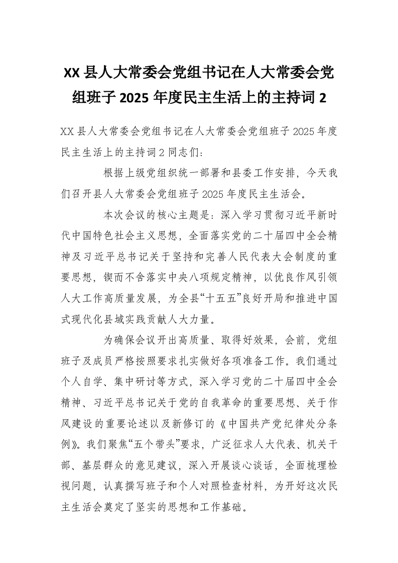 XX县人大常委会党组书记在人大常委会党组班子2025年度民主生活上的主持词2