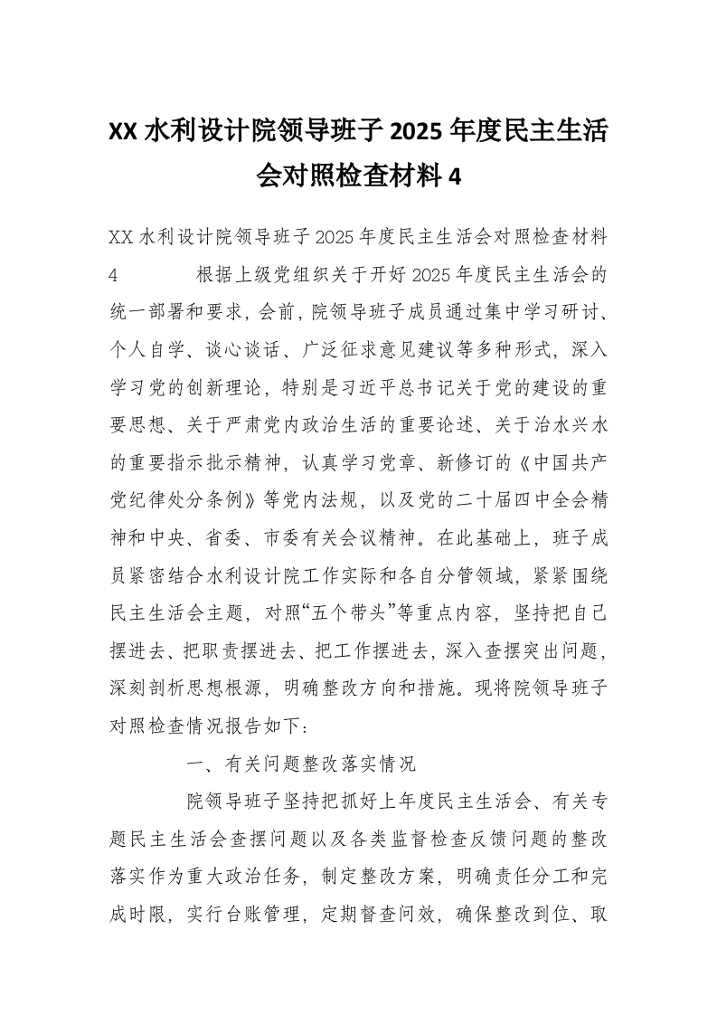 首页工作文档XX水利设计院领导班子2025年度民主生活会对照检查材料4