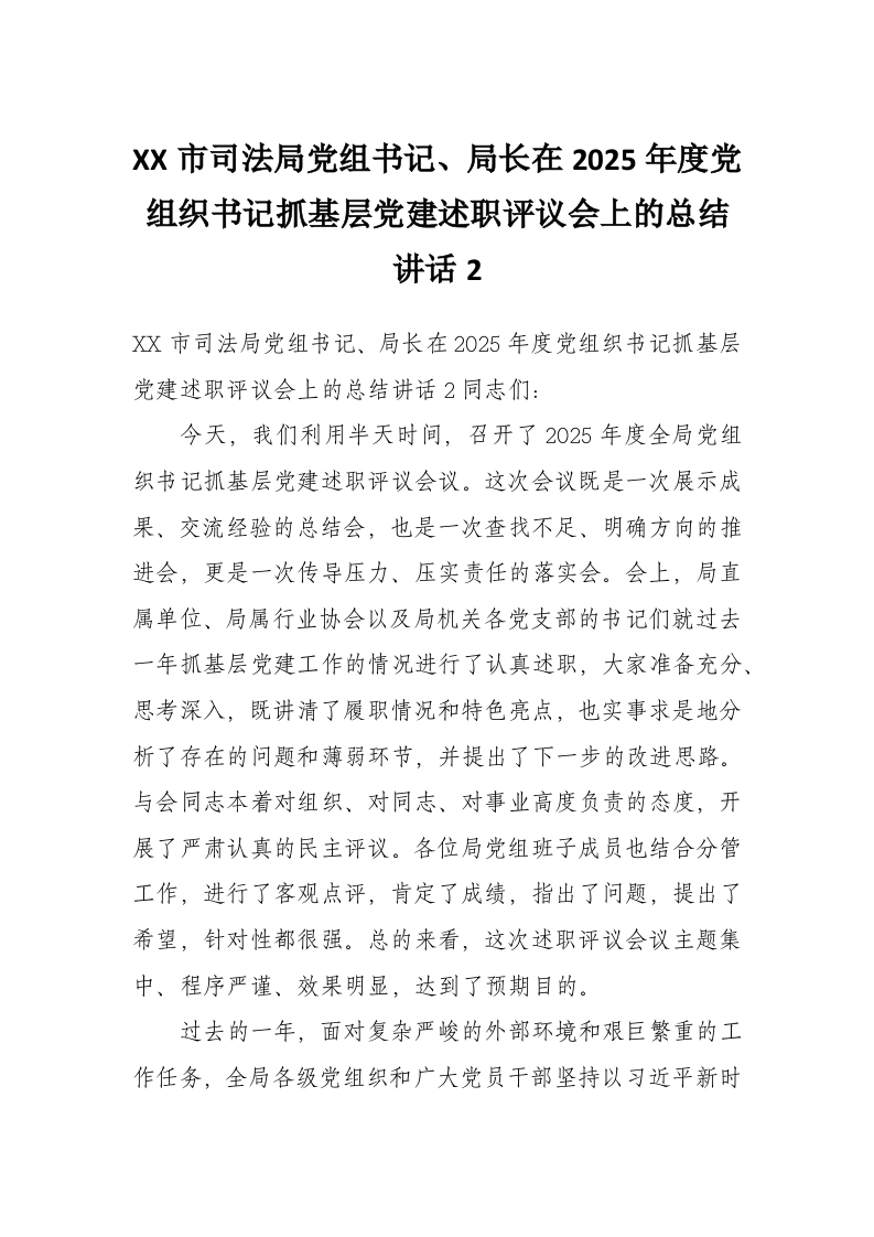 XX市司法局党组书记、局长在2025年度党组织书记抓基层党建述职评议会上的总结讲话2