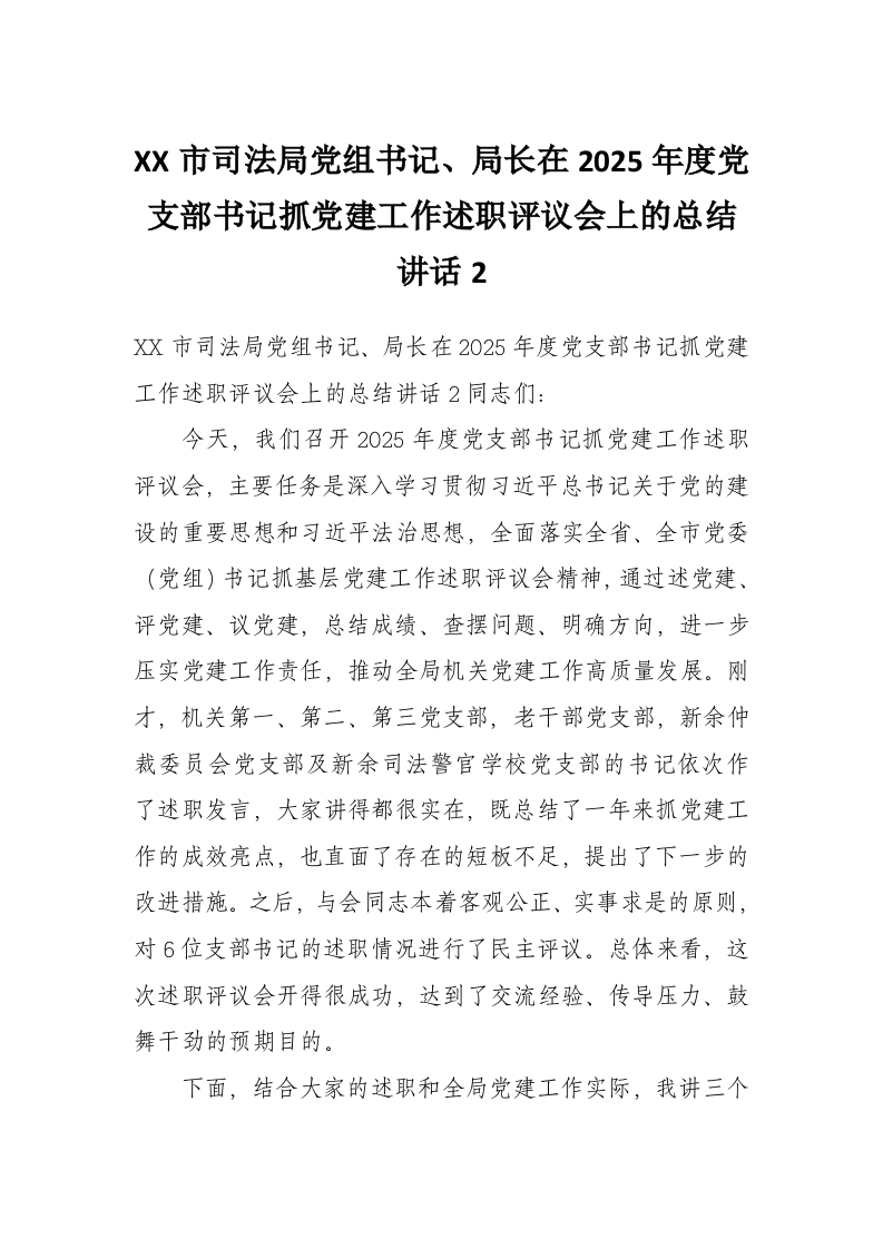 XX市司法局党组书记、局长在2025年度党支部书记抓党建工作述职评议会上的总结讲话2