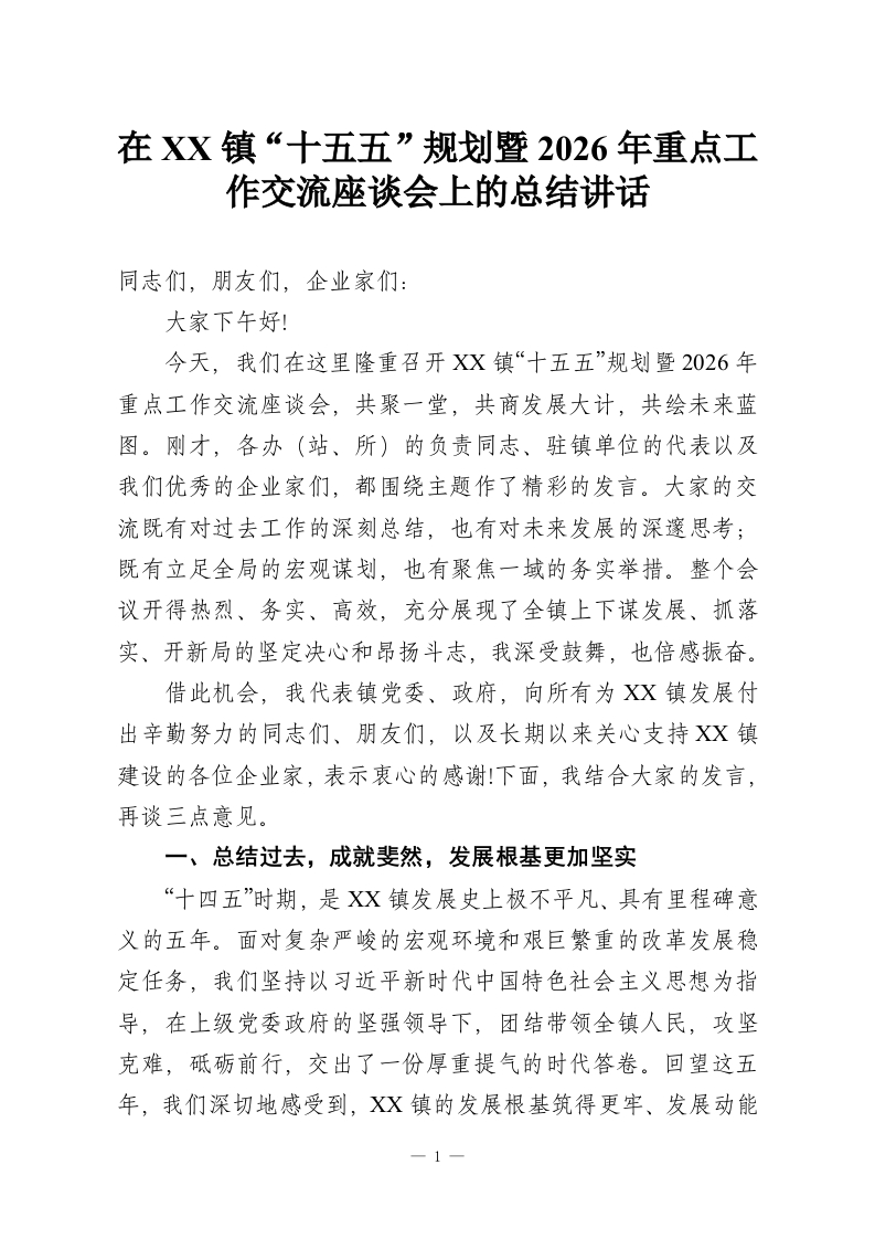 在XX镇“十五五”规划暨2026年重点工作交流座谈会上的总结讲话