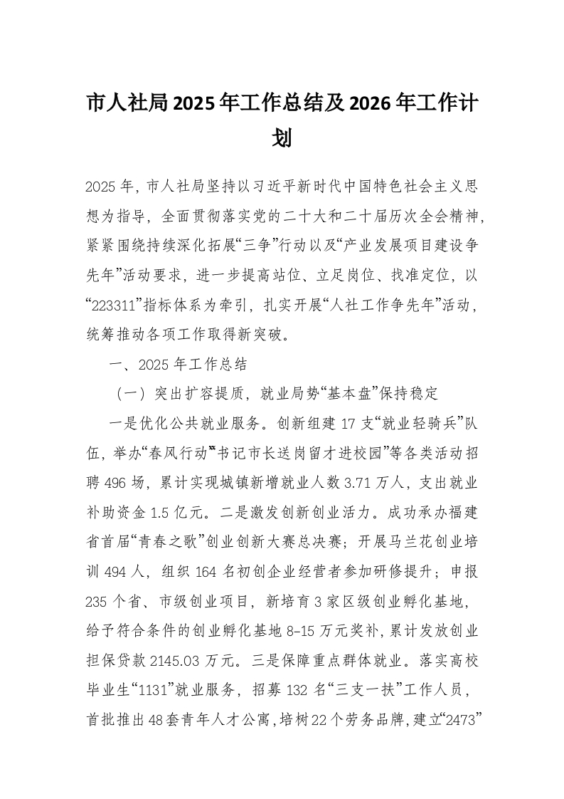 市人社局2025年工作总结及2026年工作计划