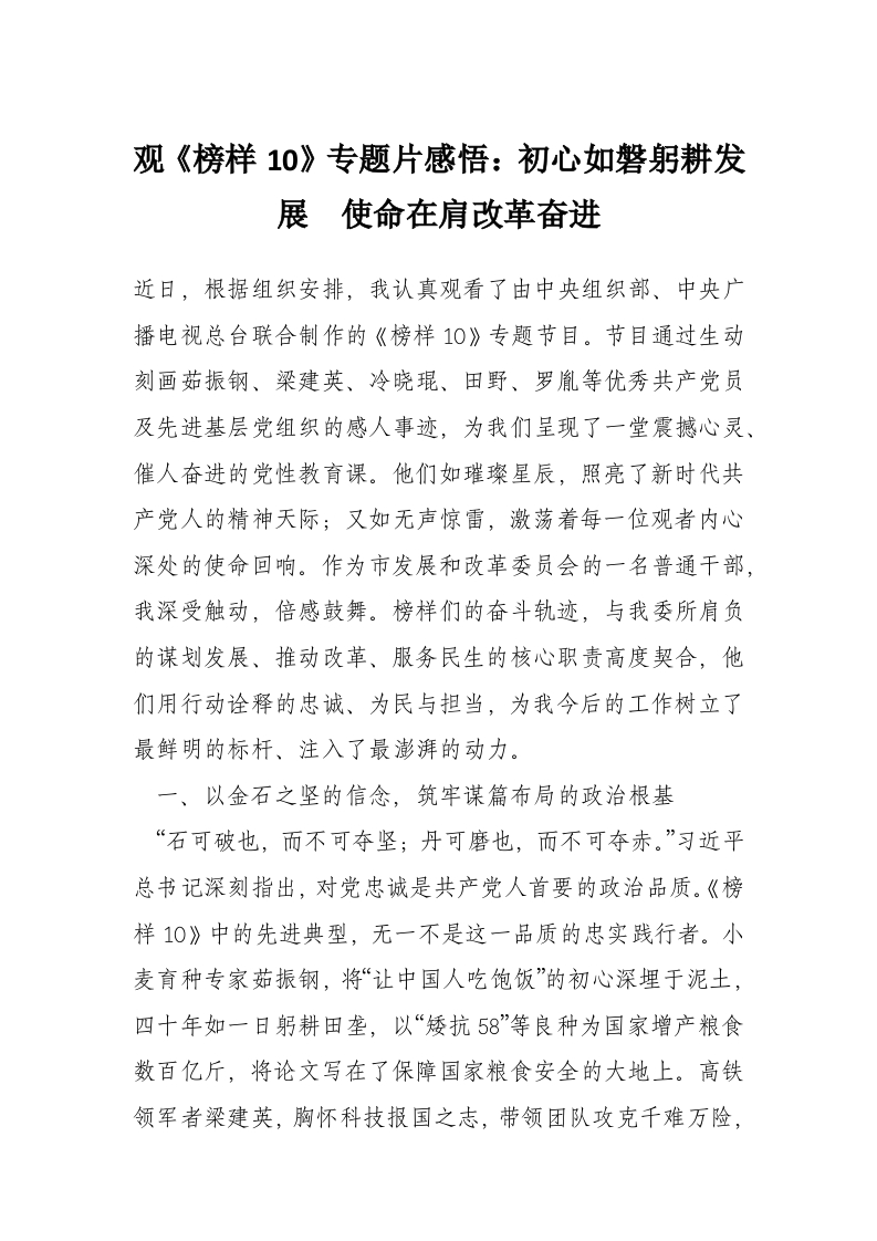 观《榜样10》专题片感悟:初心如磐躬耕发展 使命在肩改革奋进