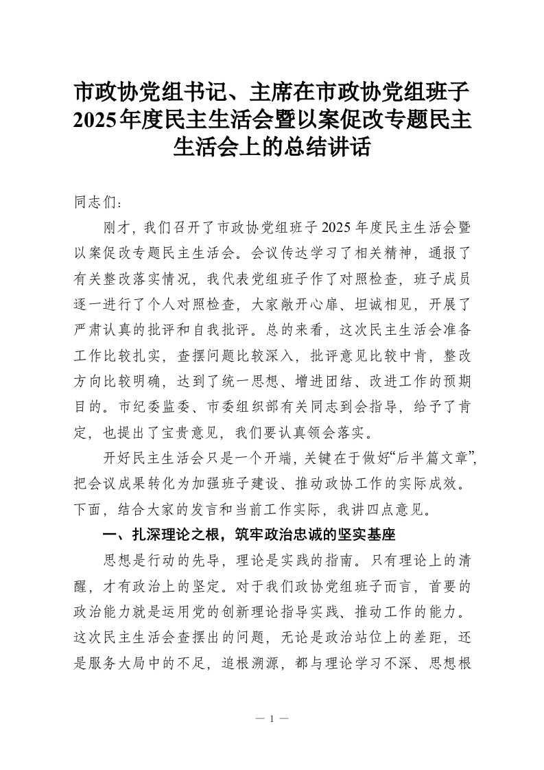 首页精选范文市政协党组书记、主席在市政协党组班子2025年度民主生活会暨以案促改专题民主生活会上的总结讲话