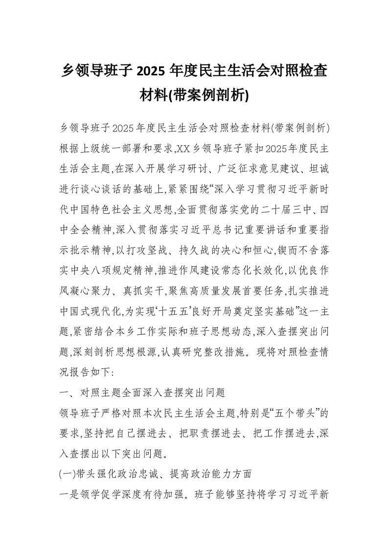 乡领导班子2025年度民主生活会对照检查材料(带案例剖析)