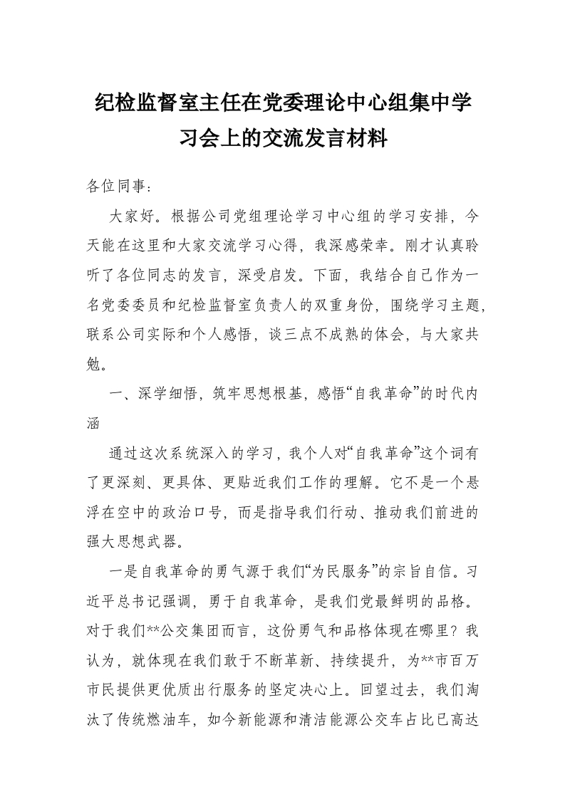 纪检监督室主任在党委理论中心组集中学习会上的交流发言材料
