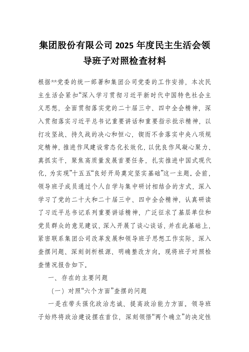 集团股份有限公司2025年度民主生活会领导班子对照检查材料