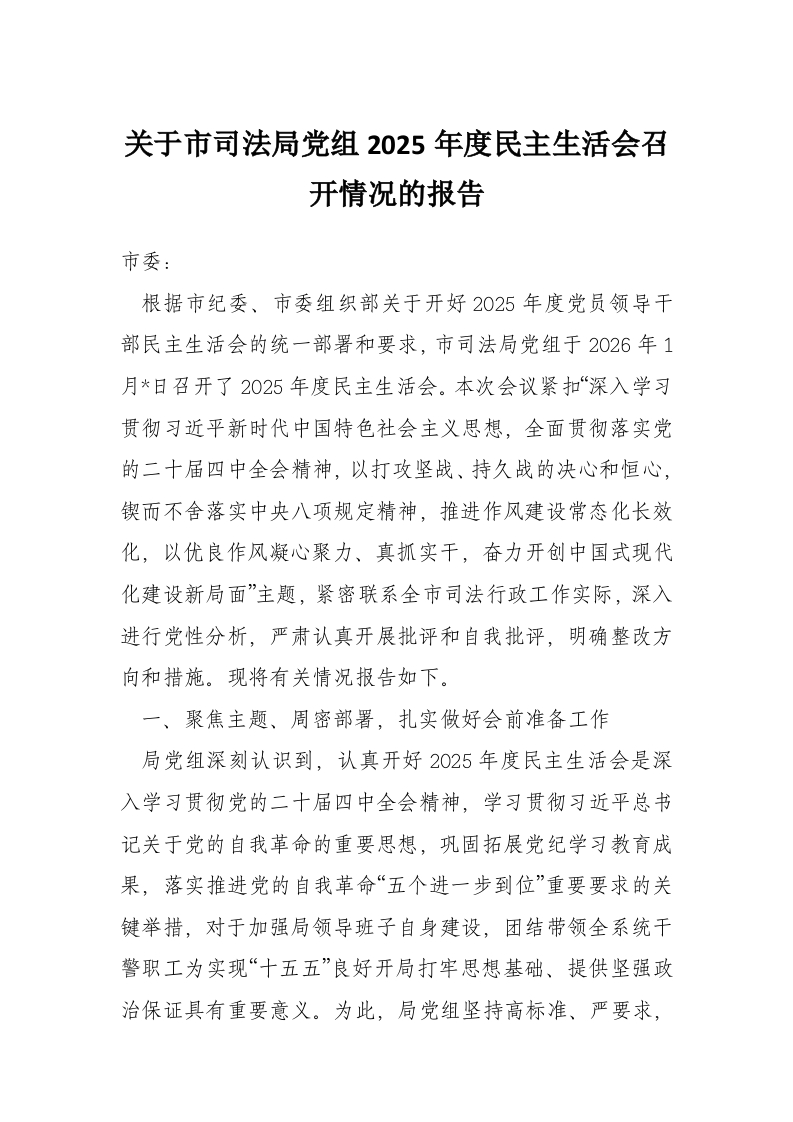 关于市司法局党组2025年度民主生活会召开情况的报告