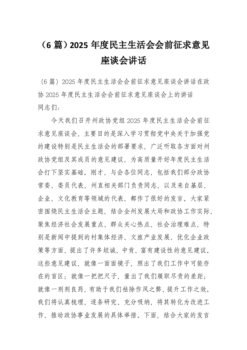 (6篇)2025年度民主生活会会前征求意见座谈会讲话