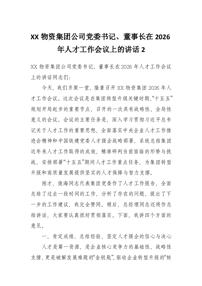 首页工作文档XX物资集团公司党委书记、董事长在2026年人才工作会议上的讲话2
