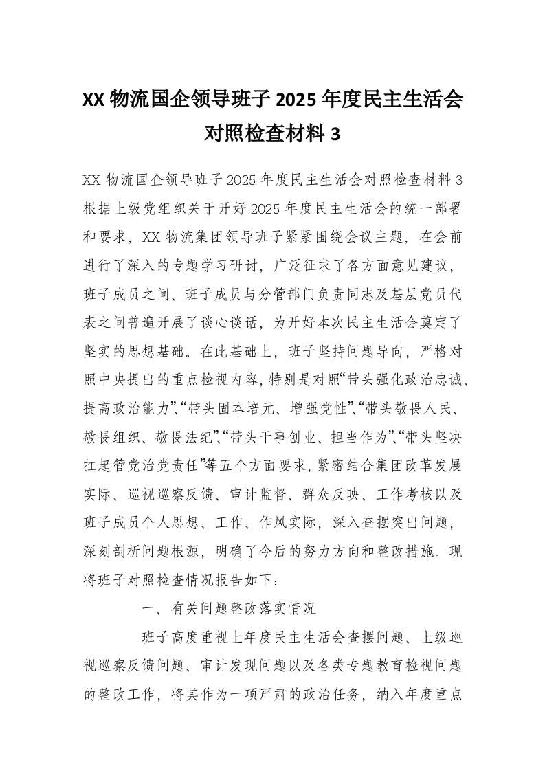 首页工作文档XX物流国企领导班子2025年度民主生活会对照检查材料3