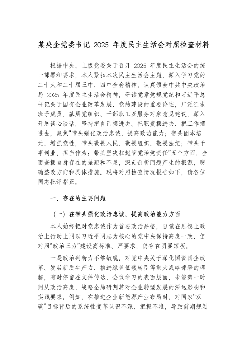 首页学习提升某央企党委书记2025年度民主生活会对照检查材料(1)