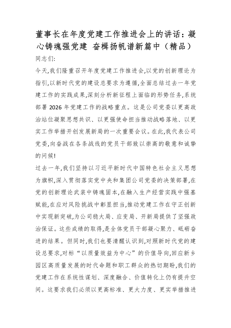 董事长在年度党建工作推进会上的讲话:凝心铸魂强党建 奋楫扬帆谱新篇中(精品)
