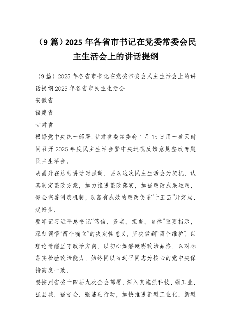 (9篇)2025年各省市书记在党委常委会民主生活会上的讲话提纲