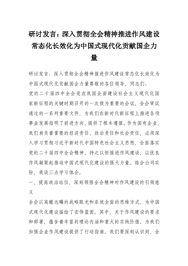 研讨发言:深入贯彻***精神推进作风建设常态化长效化为中国式现代化贡献国企力量