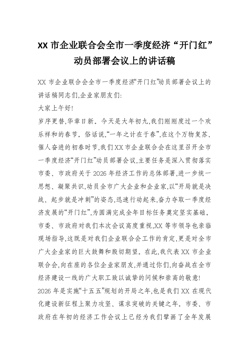 XX市企业联合会全市一季度经济“开门红”动员部署会议上的讲话稿