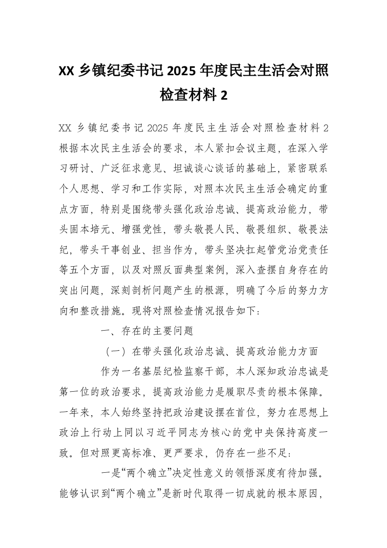 首页写作素材XX乡镇纪委书记2025年度民主生活会对照检查材料2