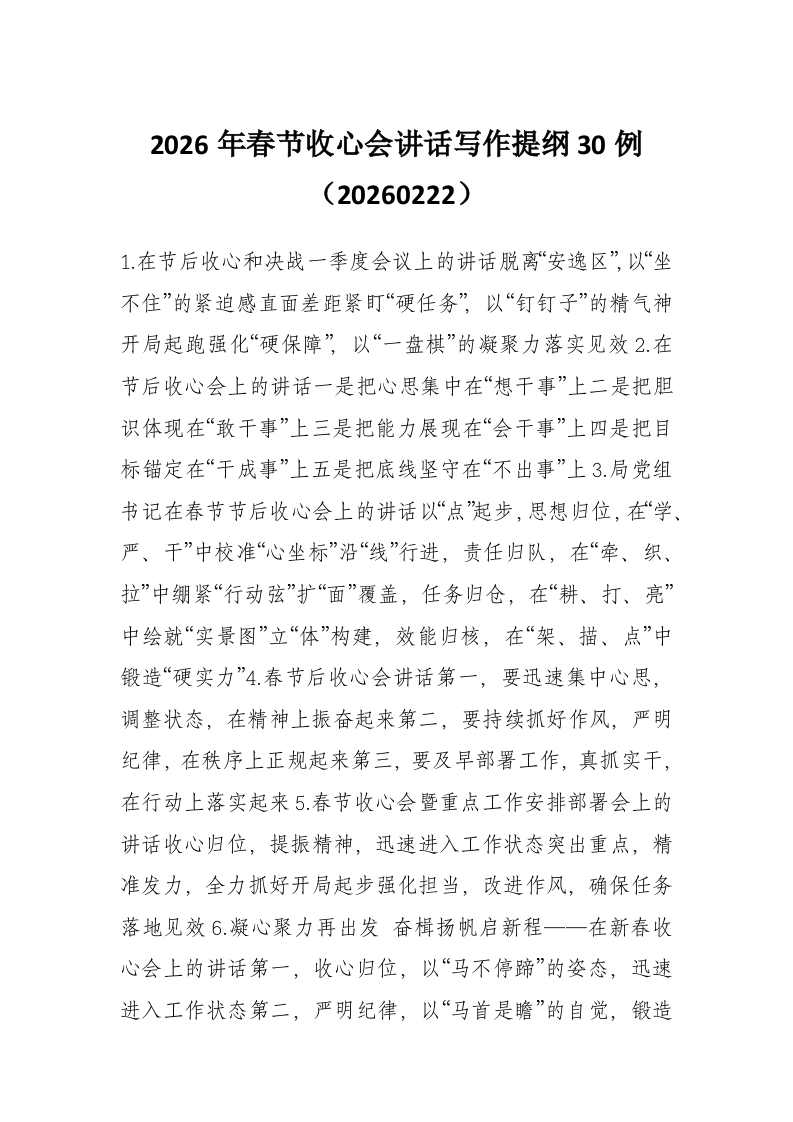 2026年春节收心会讲话写作提纲30例(20260222)