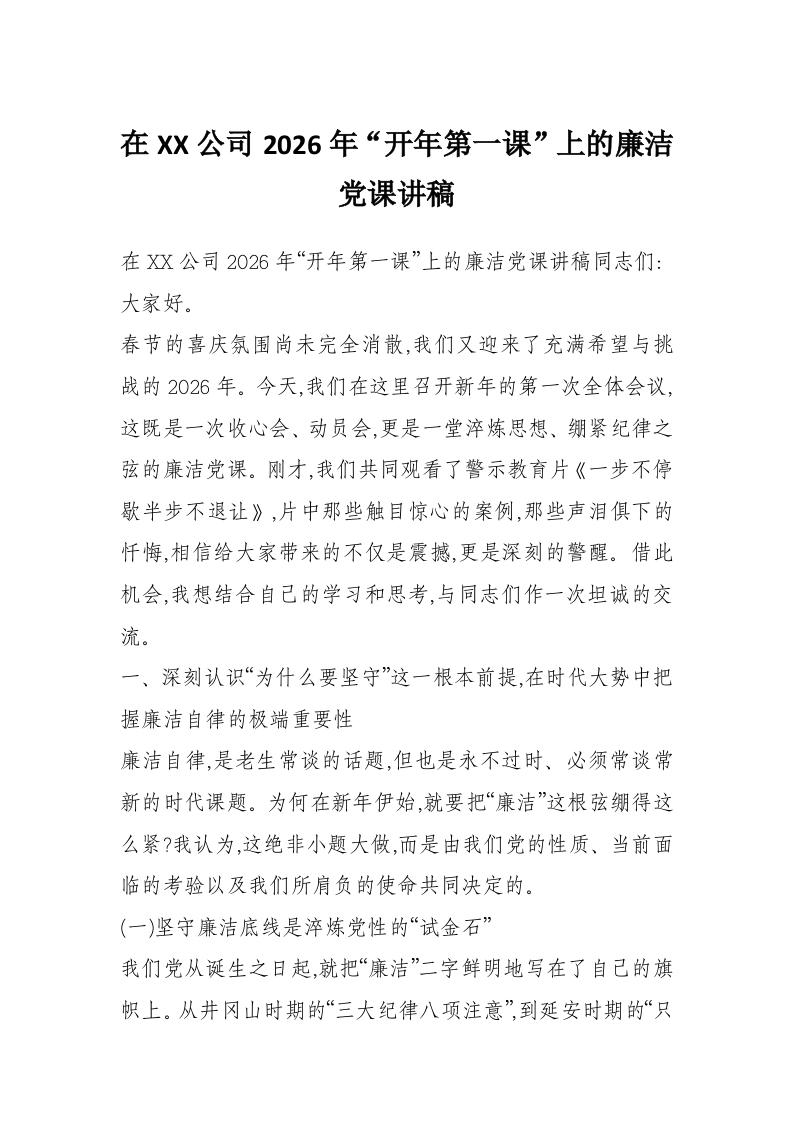 在XX公司2026年“开年第一课”上的廉洁党课讲稿