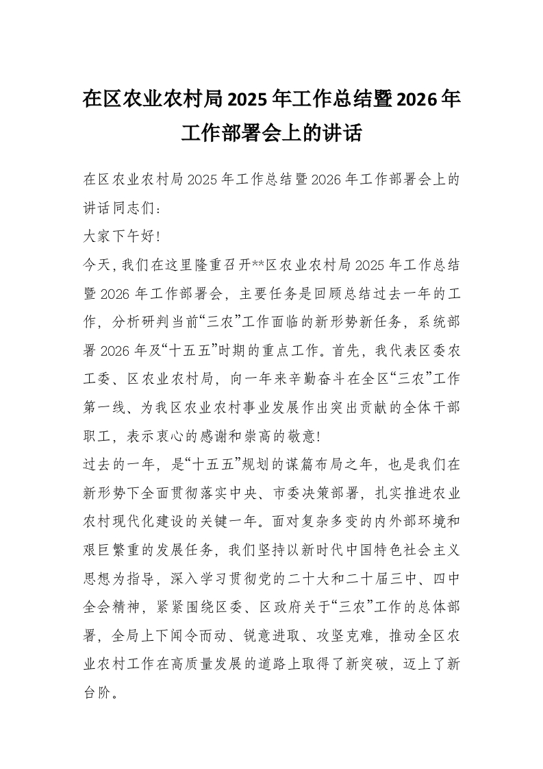 首页材料汇编在区农业农村局2025年工作总结暨2026年工作部署会上的讲话