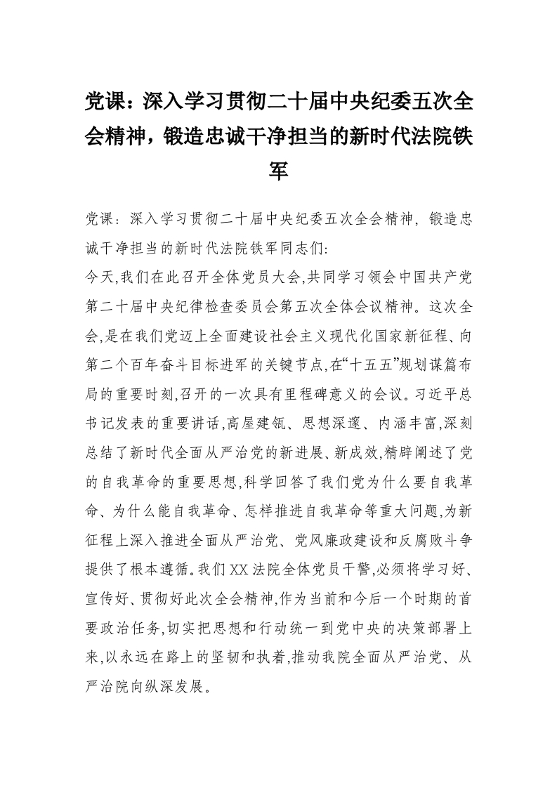 党课:深入学习贯彻二十届中央纪委五次***精神,锻造忠诚干净担当的新时代法院铁军