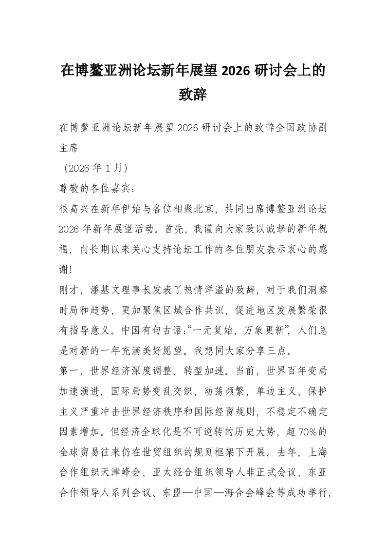 在博鳌亚洲论坛新年展望2026研讨会上的致辞