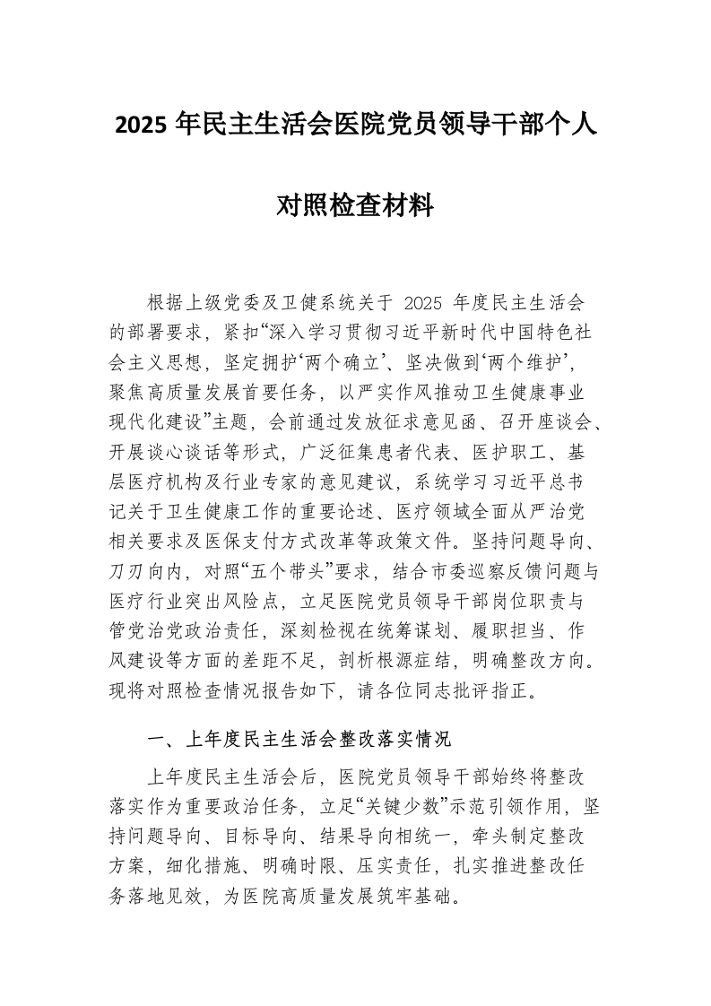 首页材料汇编2025年度医院党员领导干部民主生活会对照检查材料(2)