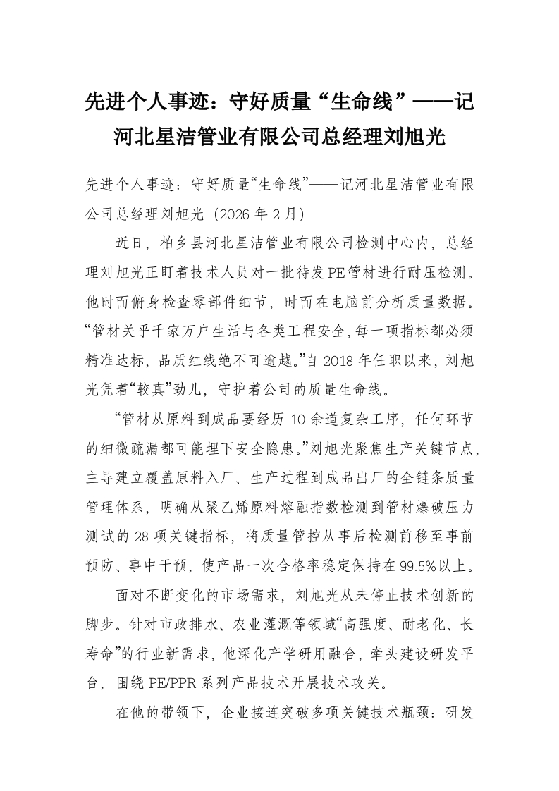 先进个人事迹:守好质量“生命线”——记河北星洁管业有限公司总经理刘旭光