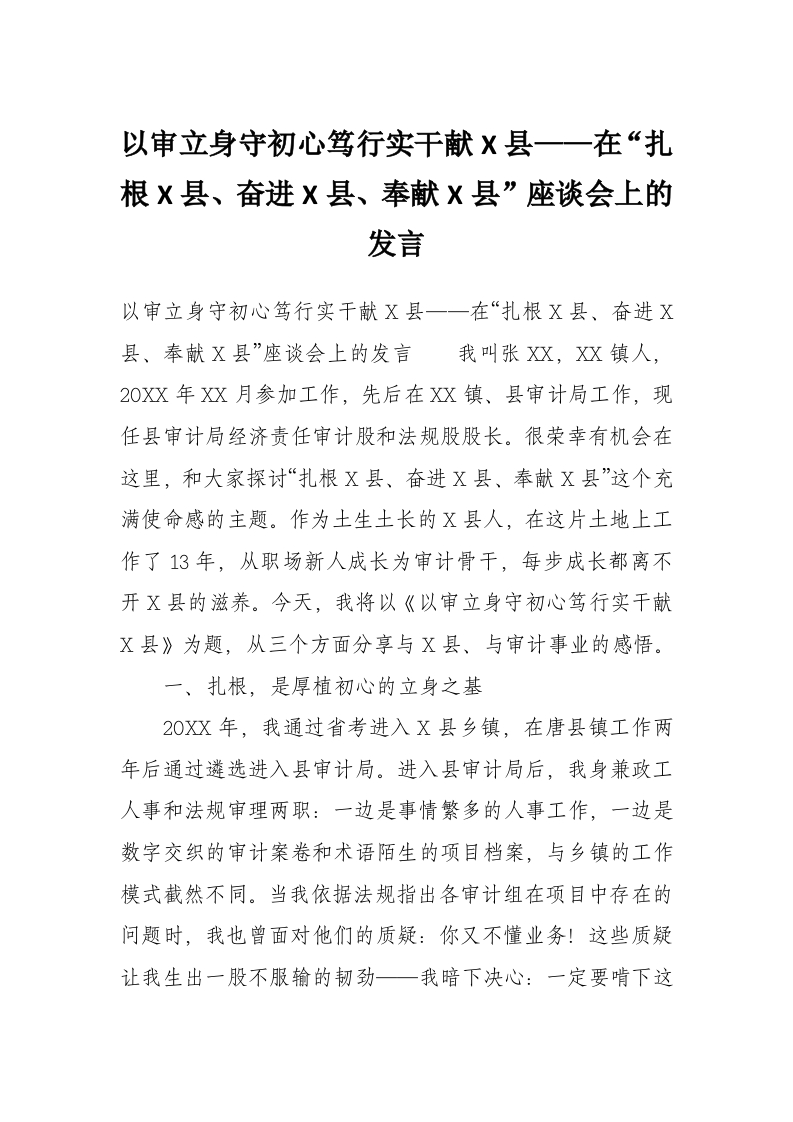 以审立身守初心笃行实干献X县——在“扎根X县、奋进X县、奉献X县”座谈会上的发言