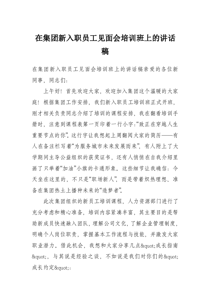 首页讲课讲稿在集团新入职员工见面会培训班上的讲话稿