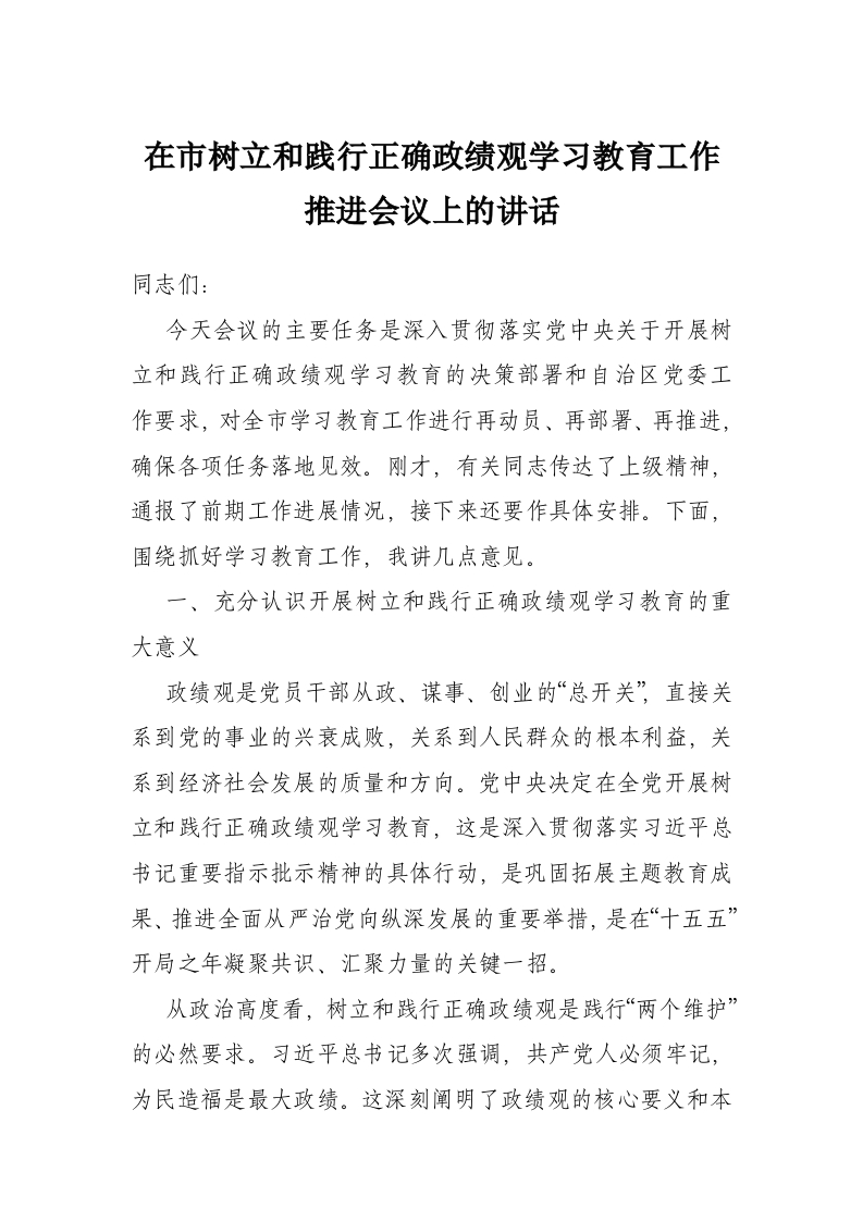 在市树立和践行正确政绩观学习教育工作推进会议上的讲话
