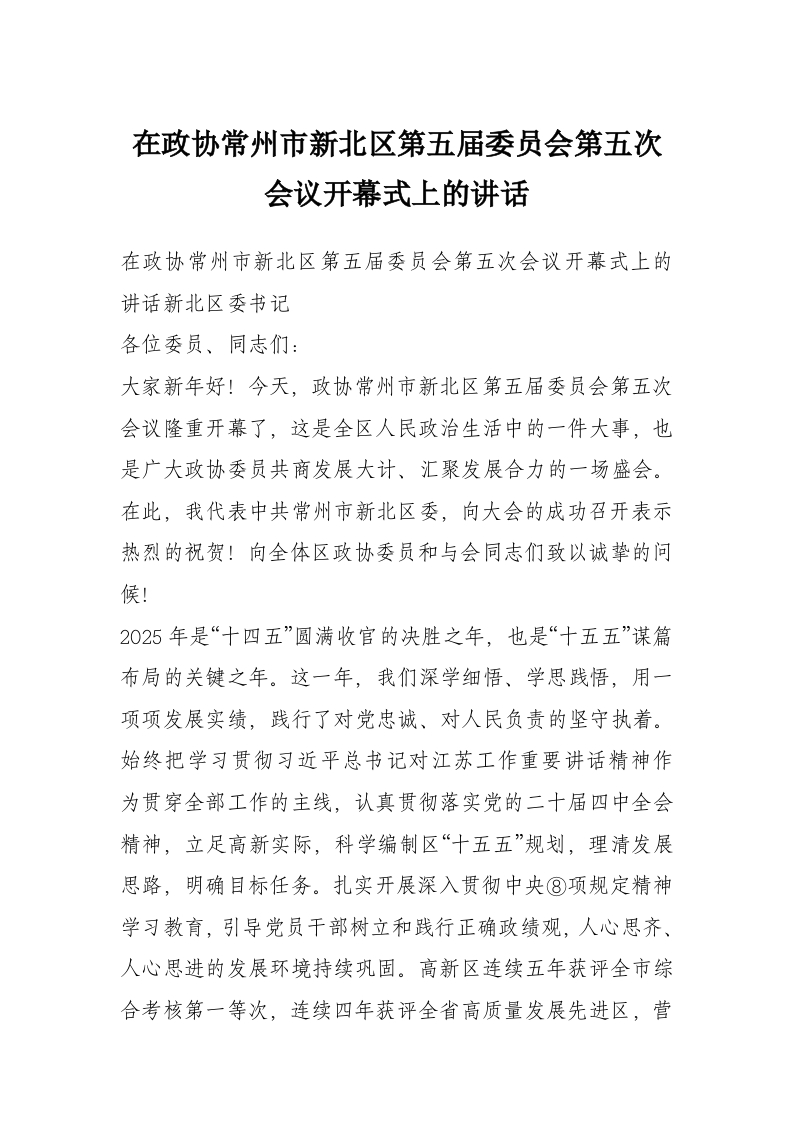 在政协常州市新北区第五届委员会第五次会议开幕式上的讲话