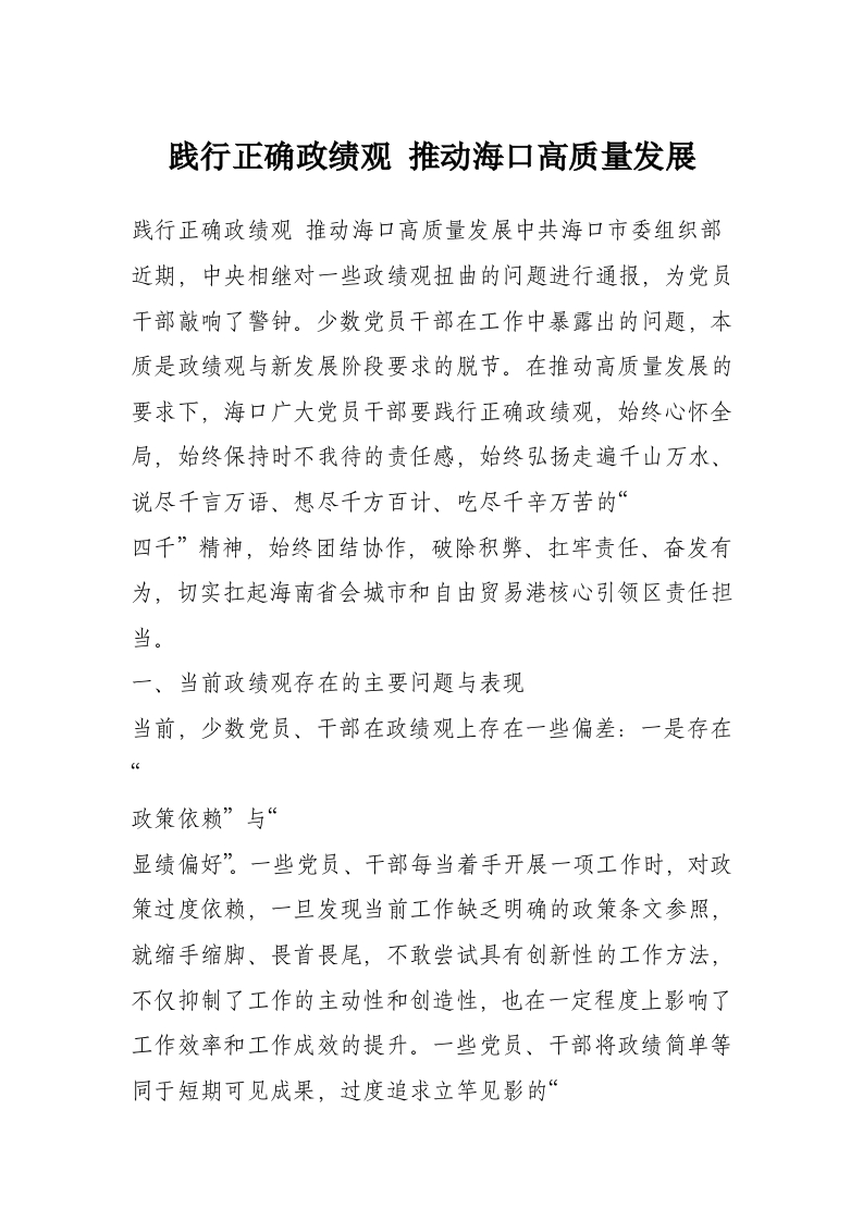 践行正确政绩观 推动海口高质量发展