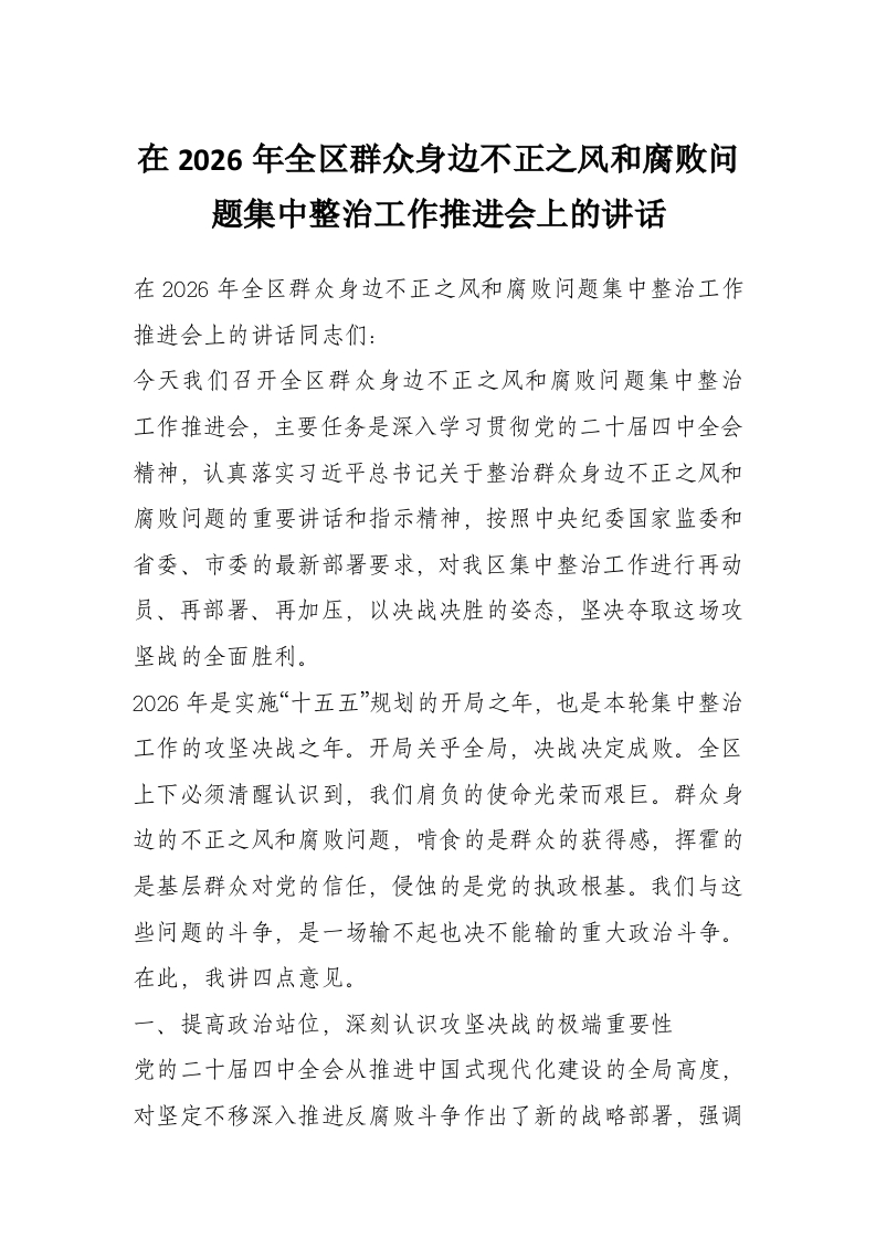 首页工作文档在2026年全区群众身边不正之风和腐败问题集中整治工作推进会上的讲话