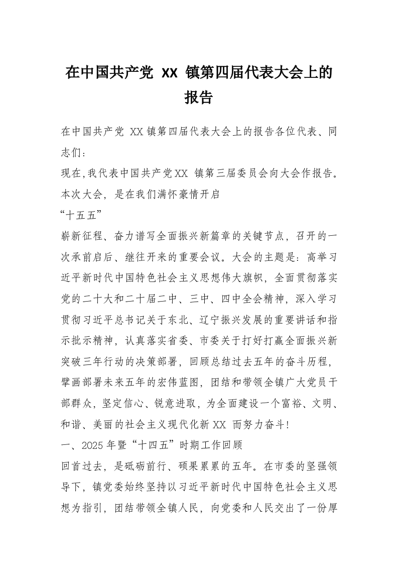 在中国*** XX 镇第四届代表大会上的报告