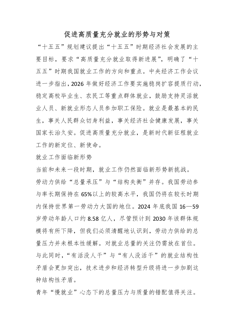 促进高质量充分就业的形势与对策