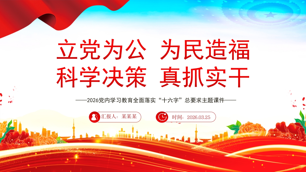 首页PPT模板红色精美立党为公 为民造福 科学决策 真抓实干PPT全面落实“十六字”总要求课件