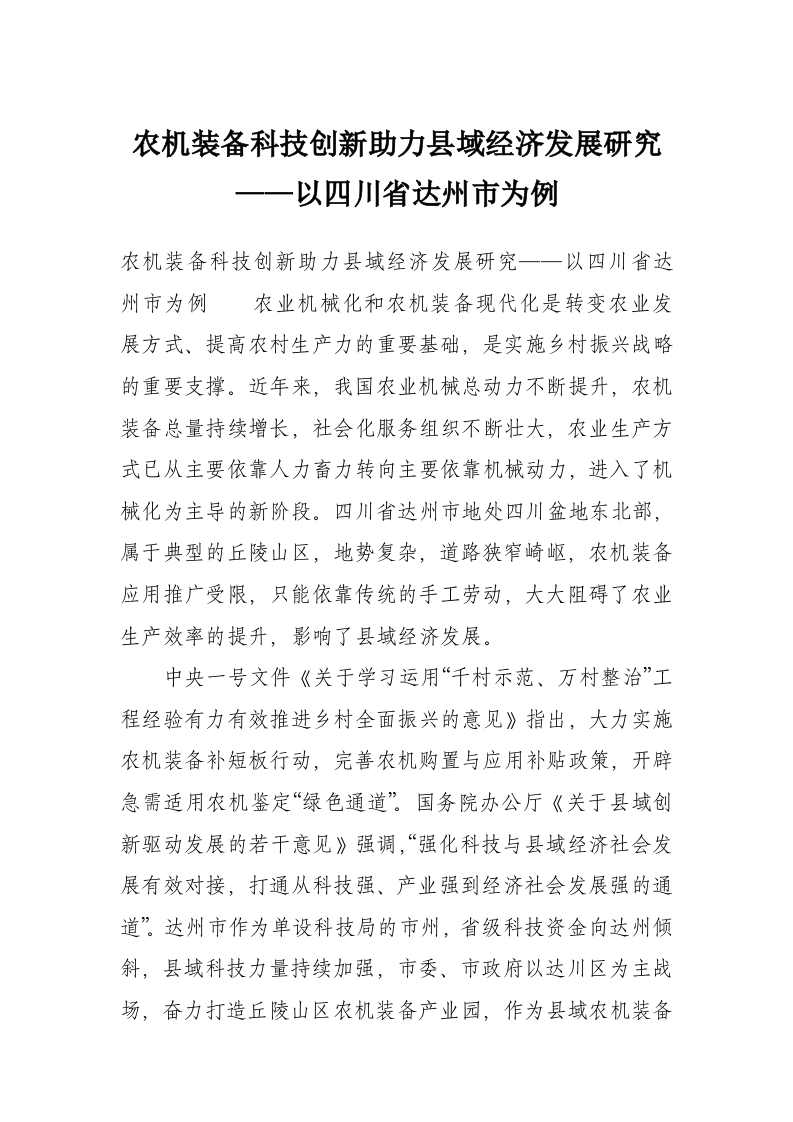 农机装备科技创新助力县域经济发展研究——以四川省达州市为例
