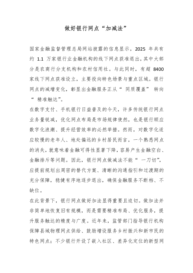 做好银行网点“加减法”