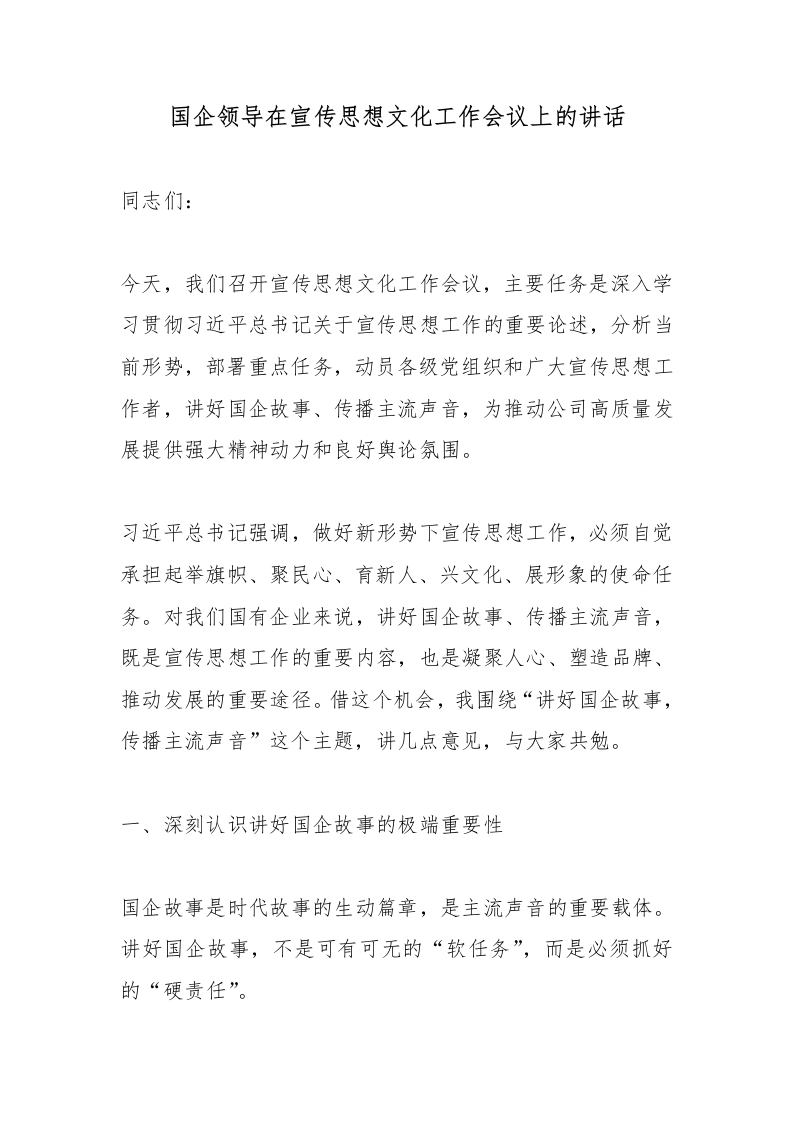 国企领导在宣传思想文化工作会议上的讲话(1)