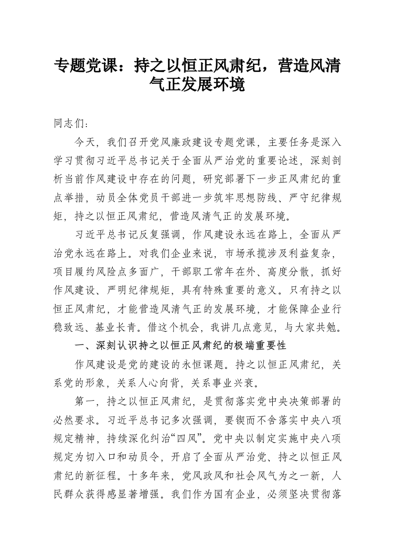 专题党课:持之以恒正风肃纪,营造风清气正发展环境