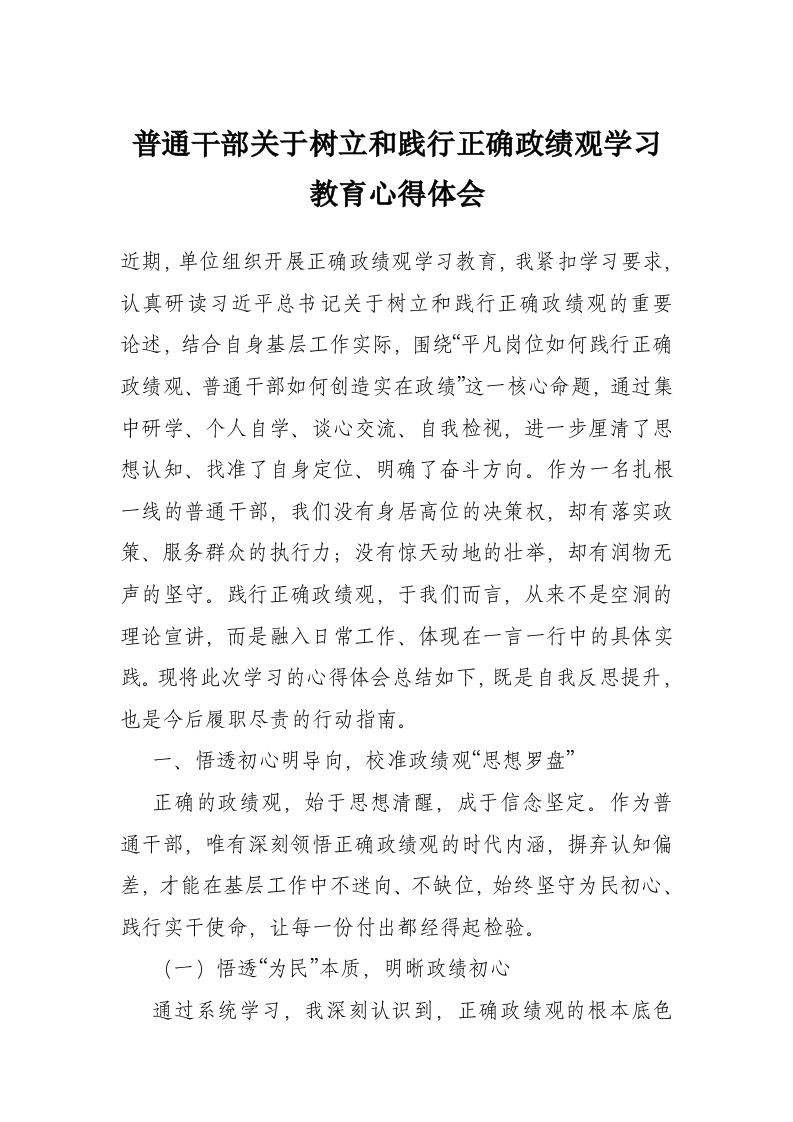 - 县委办公室普通干部树立和践行正确政绩观学习教育心得体会