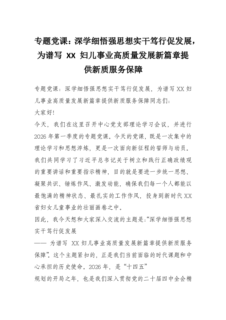专题党课:深学细悟强思想实干笃行促发展,为谱写 XX 妇儿事业高质量发展新篇章提供新质服务保障