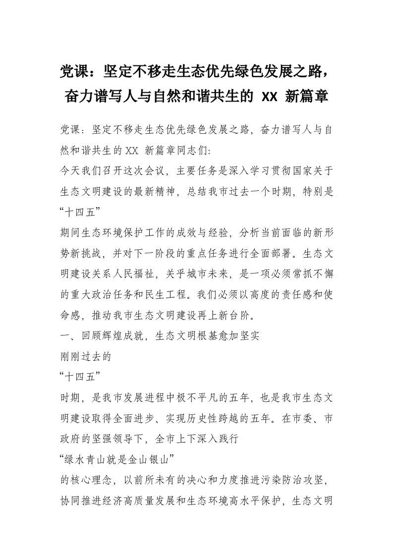 党课:坚定不移走生态优先绿色发展之路,奋力谱写人与自然和谐共生的 XX 新篇章