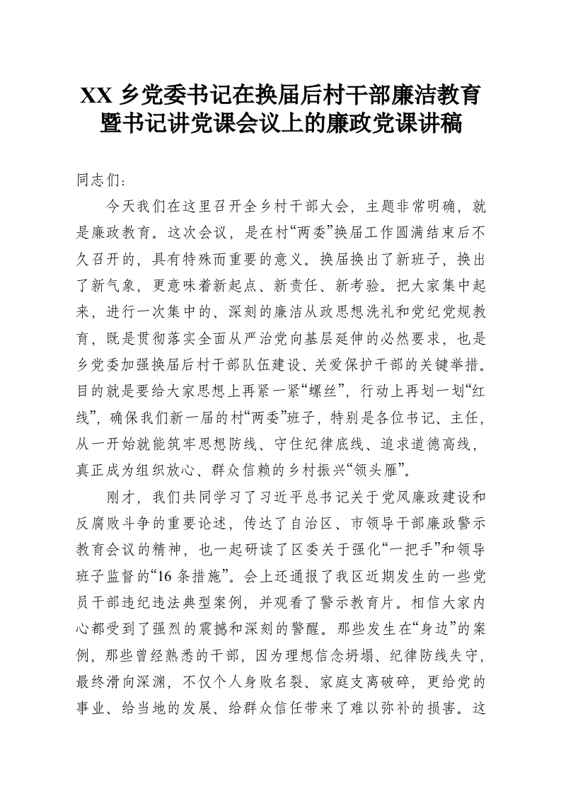XX乡党委书记在换届后村干部廉洁教育暨书记讲党课会议上的廉政党课讲稿